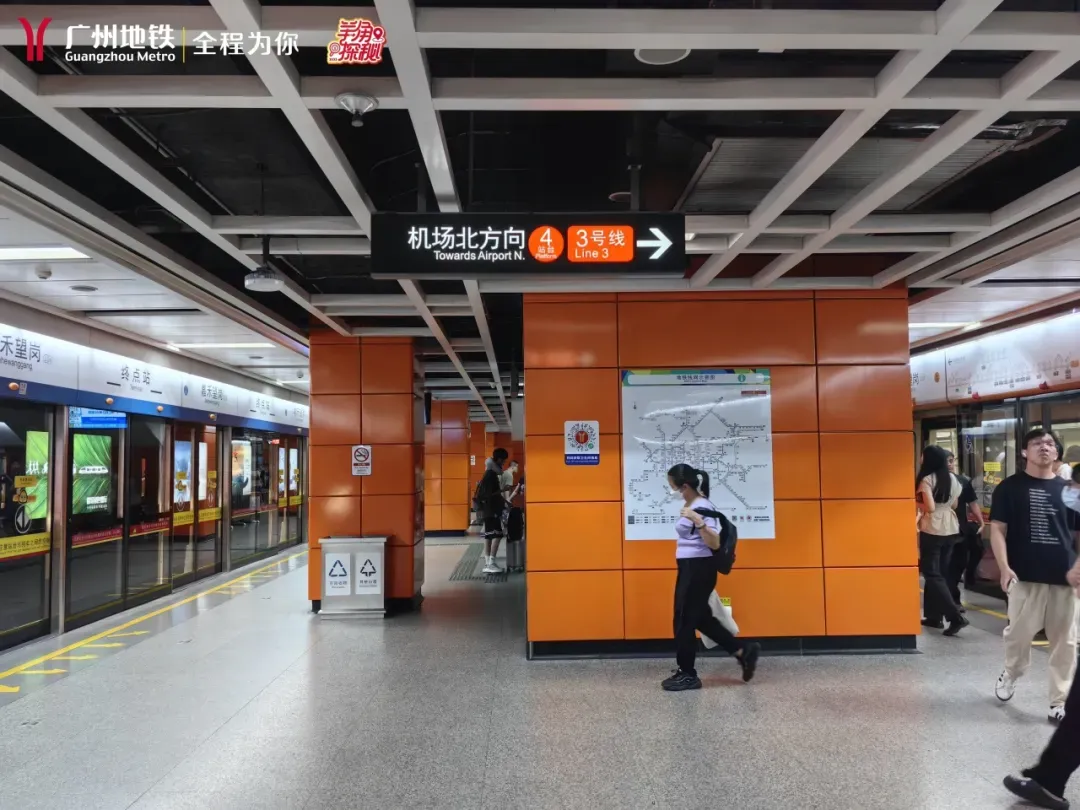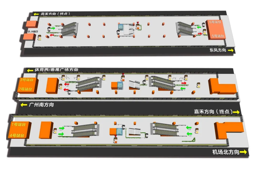3号线体育西路/番禺广场方向与2号线广州南站方向为同一岛式站台,2条线3个方向可在同一站台快速换乘。